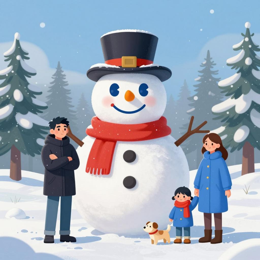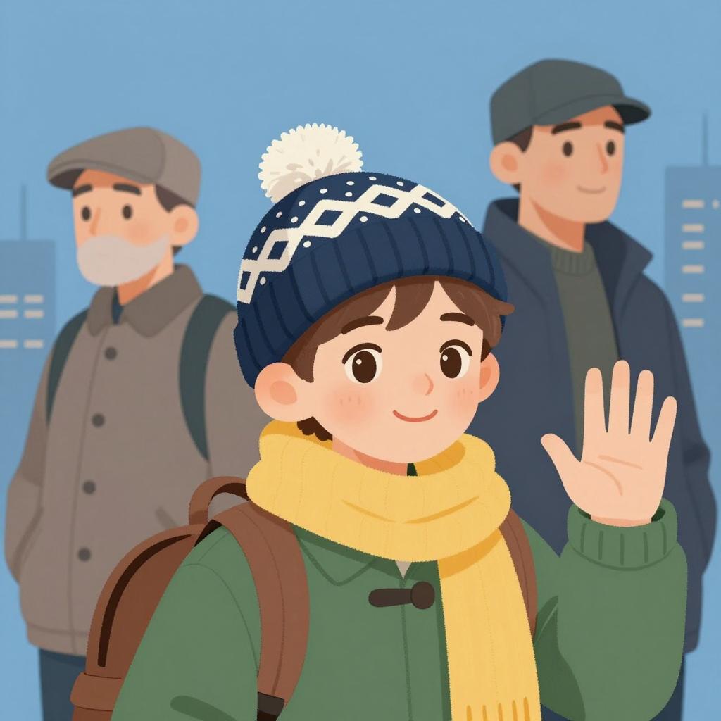 Young boy with fair skin, light brown hair, wearing a navy and white patterned knitted hat, green coat, and yellow scarf, smiling and waving. Brown backpack on his back. Blue background with a city skyline. Two older men in the background, one with a beard, both wearing hats and coats, looking in different directions. Digital illustration style.