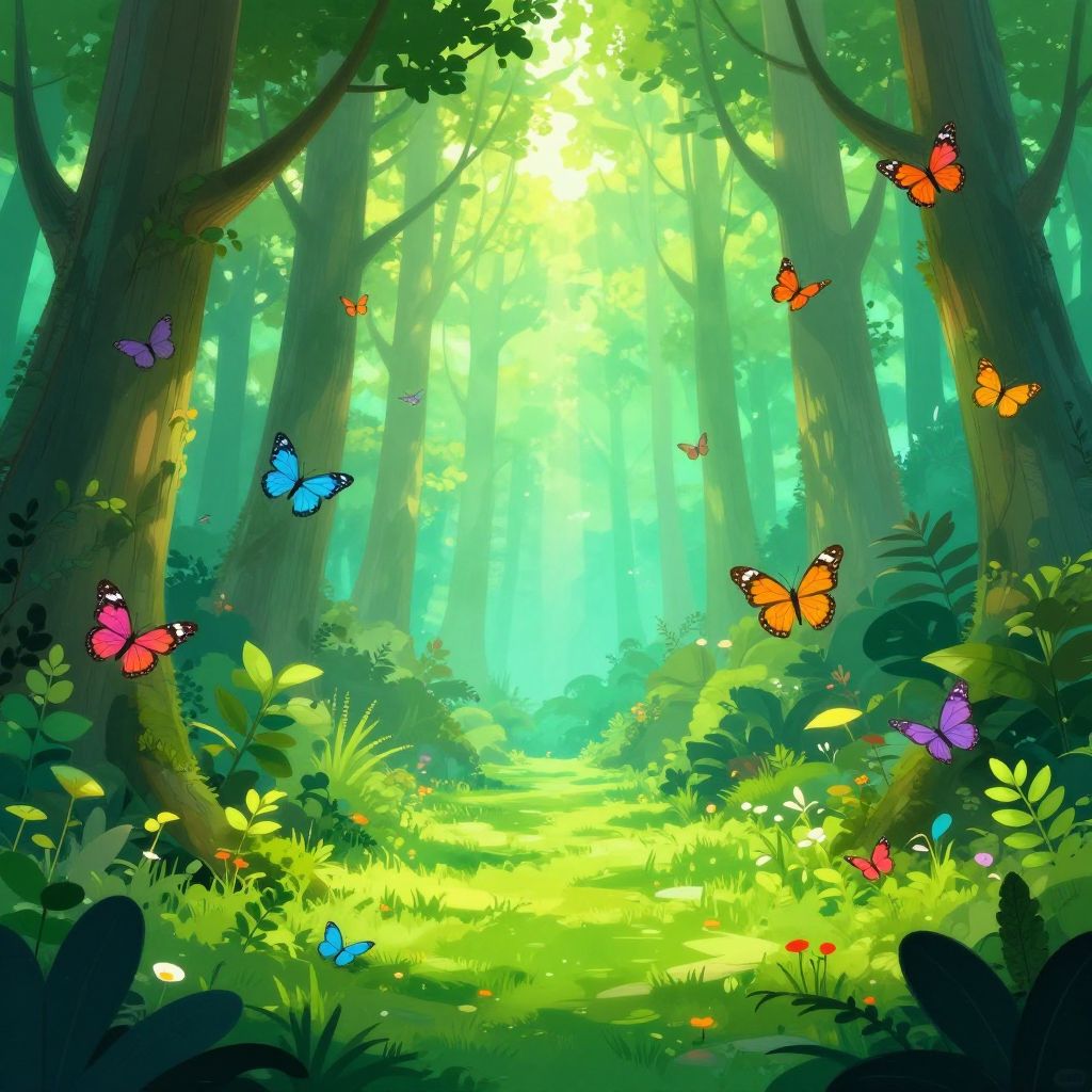 Cartoon meadow scene featuring rolling hills, a sparkling stream, and animated butterflies fluttering among diverse flowers, bright and lively colors