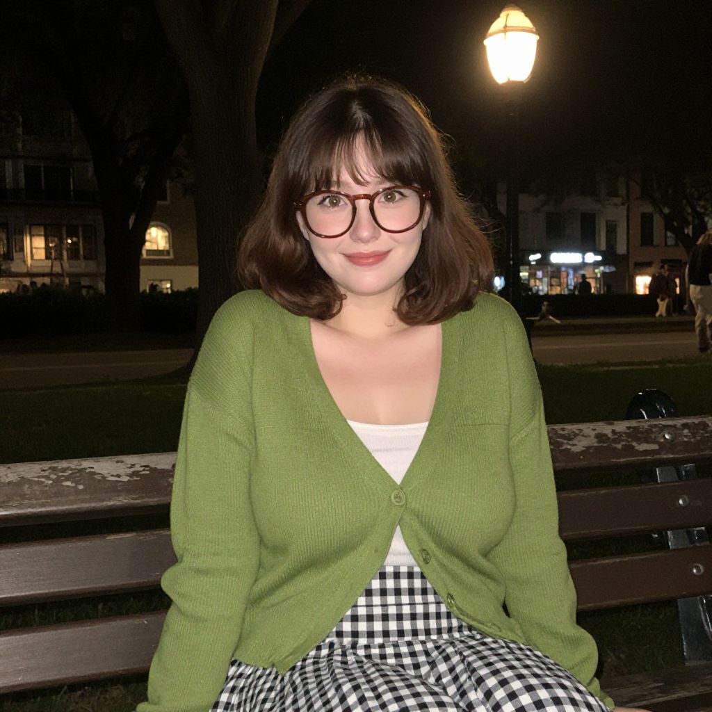 A relaxed woman enjoying a night out with friends in a casual costume — she’s dressed as a vintage librarian with a flowing green cardigan, a checkered skirt, and oversized glasses, sitting on a park bench under a streetlamp at night, her face has warm brown eyes, soft features, and a friendly smile, surrounded by the city glow and soft ambient lighting. The woman has big tits and cute face