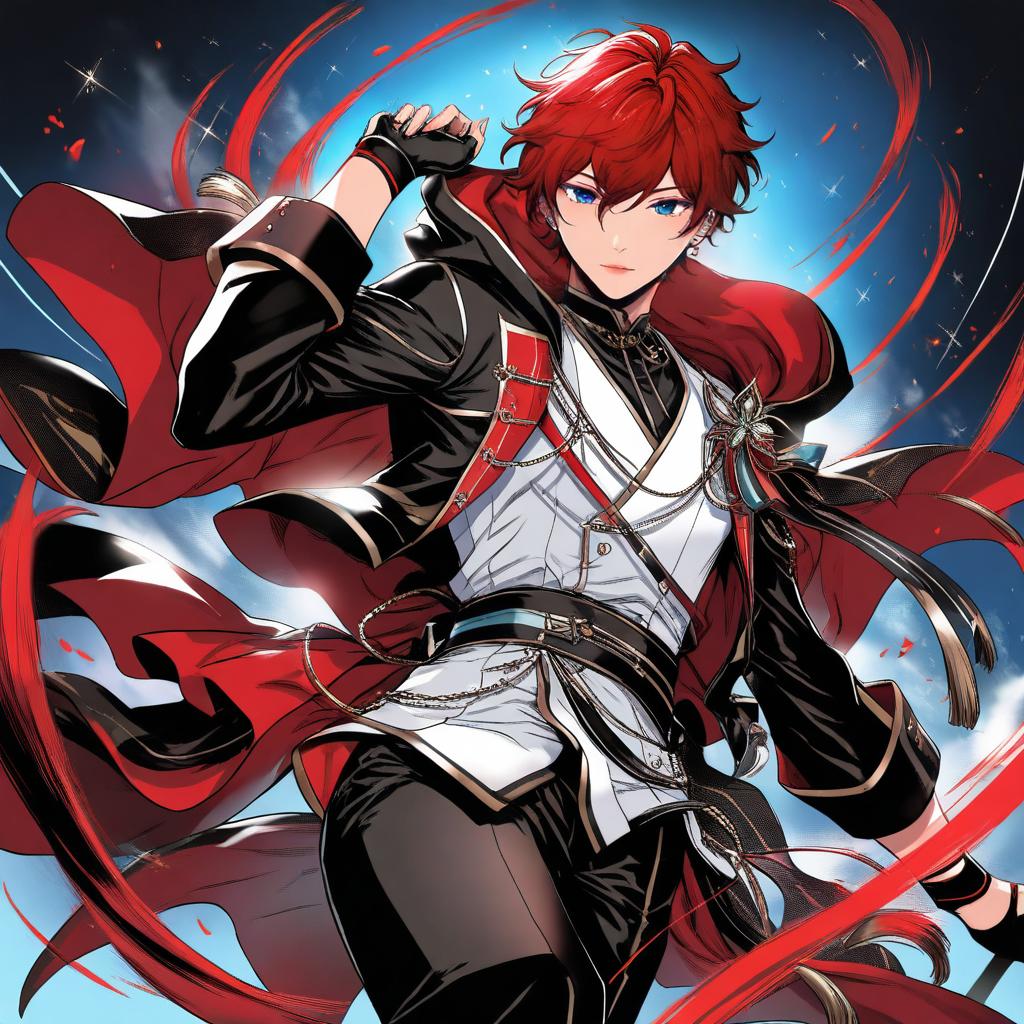Digital illustration of Amagi Hiiro, a male anime character from Ensemble Stars! with striking blue eyes and short red hair partially covering his eyes. He wears a detailed black and white costume with red accents, including a flowing red cape and intricate metallic chains and accessories. The background is a dynamic blue with red swirling effects, enhancing the energetic and stylish pose.