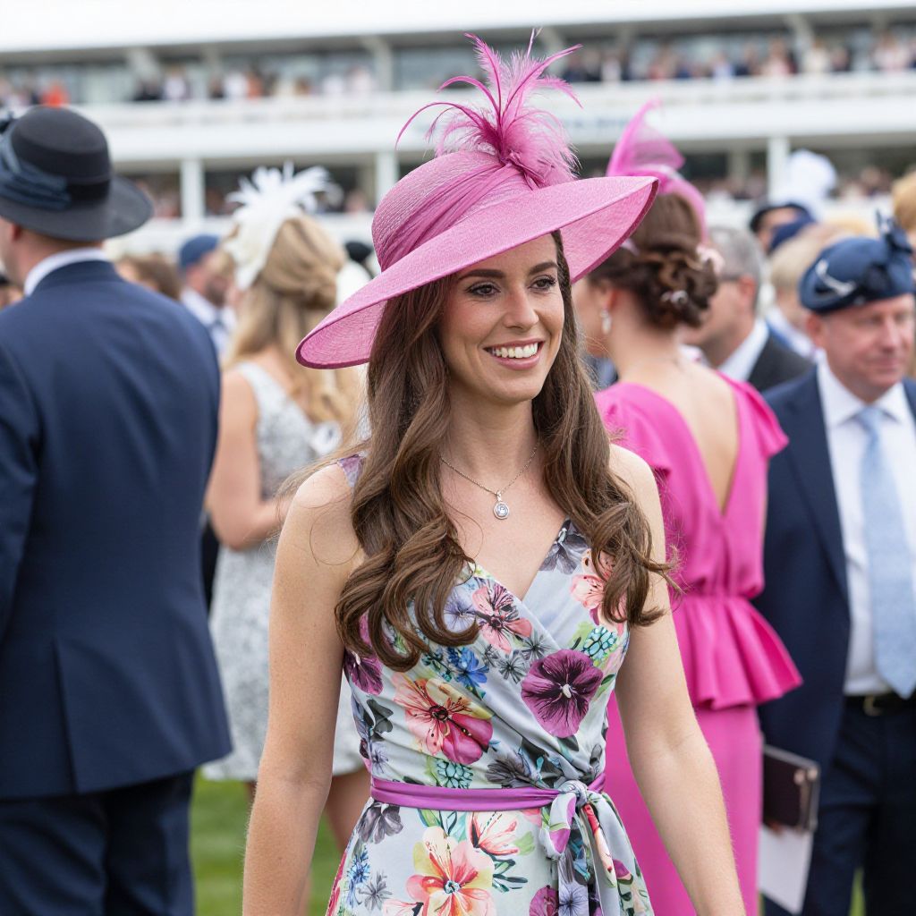 Photograph of a smiling Caucasian woman with long brown hair, wearing a pink wide-brimmed hat adorned with a feather, and a sleeveless, floral-patterned dress with a pink sash. She stands among a group of elegantly dressed people at an outdoor event, with blurred spectators and a racetrack in the background. Other attendees include men in black suits and women in pink and white dresses, some wearing hats. The image has a vibrant, high-contrast style, emphasizing the bright colors and formal attire.