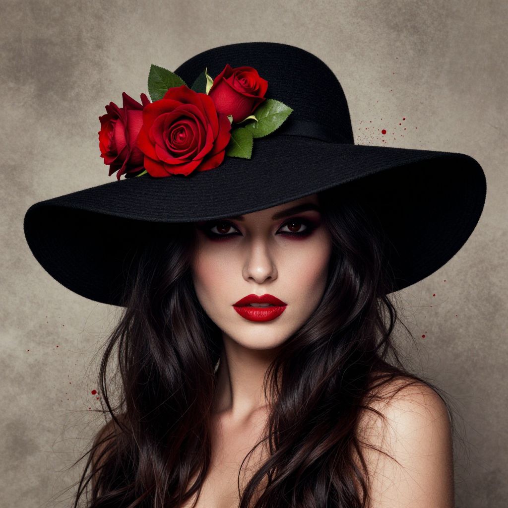 Mysterious woman wearing a wide-brimmed black hat adorned with two vibrant red roses and green leaves, her face accentuated by bold red makeup and framed by cascading dark hair, set against a textured background splattered with red ink-like droplets.