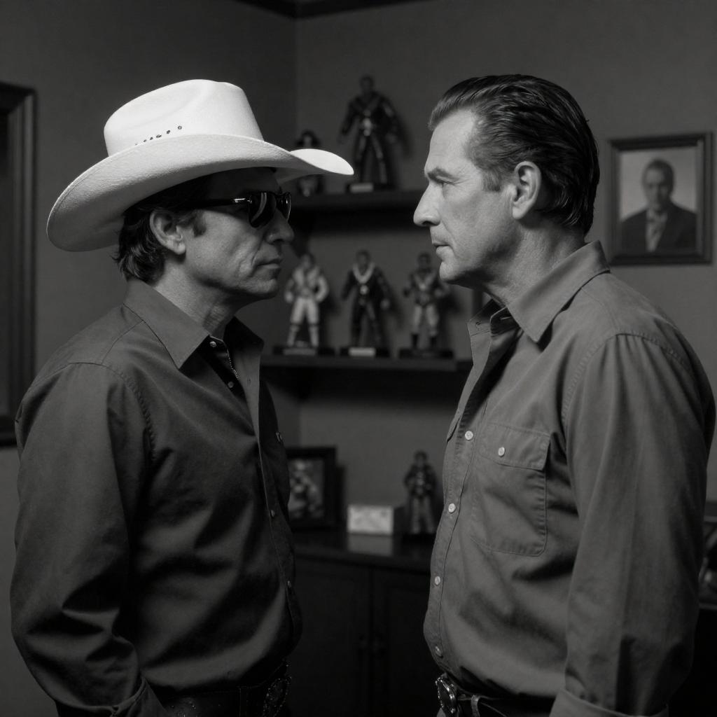 Black-and-white photograph of two men facing each other in a dimly lit room. The man on the left wears a cowboy hat and sunglasses, while the man on the right, with slicked-back hair, wears a button-up shirt. Behind them, shelves display figurines and framed portraits. The men are engaged in a serious conversation.