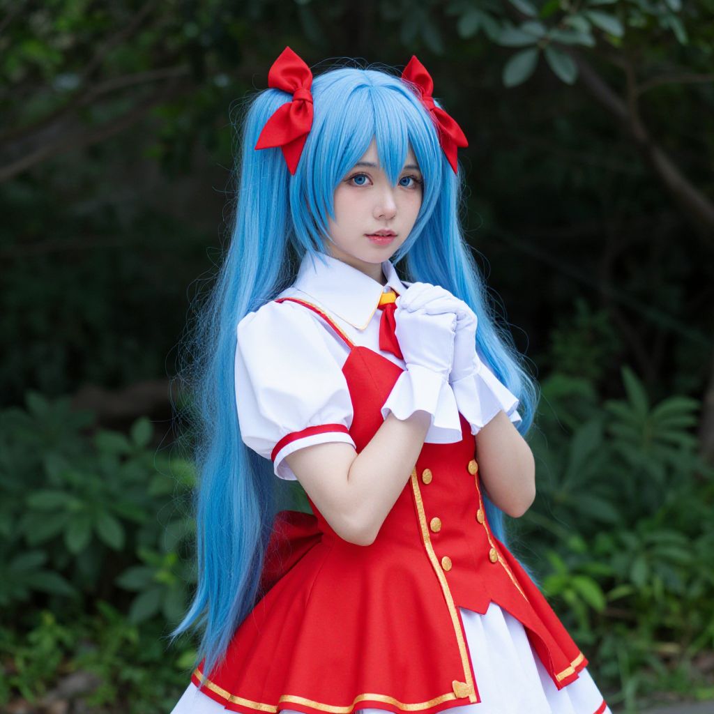 Photograph of an Asian woman with long blue hair, red ribbons, and a red and white anime-style outfit, standing outdoors with dark green foliage