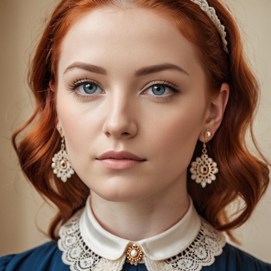 A close-up realistic portrait of a young woman with striking blue eyes and red hair styled elegantly, soft natural lighting emphasizing smooth skin texture and freckles, wearing vintage-style clothing with a high lace collar and delicate earrings, warm peach and beige color tones, neutral background