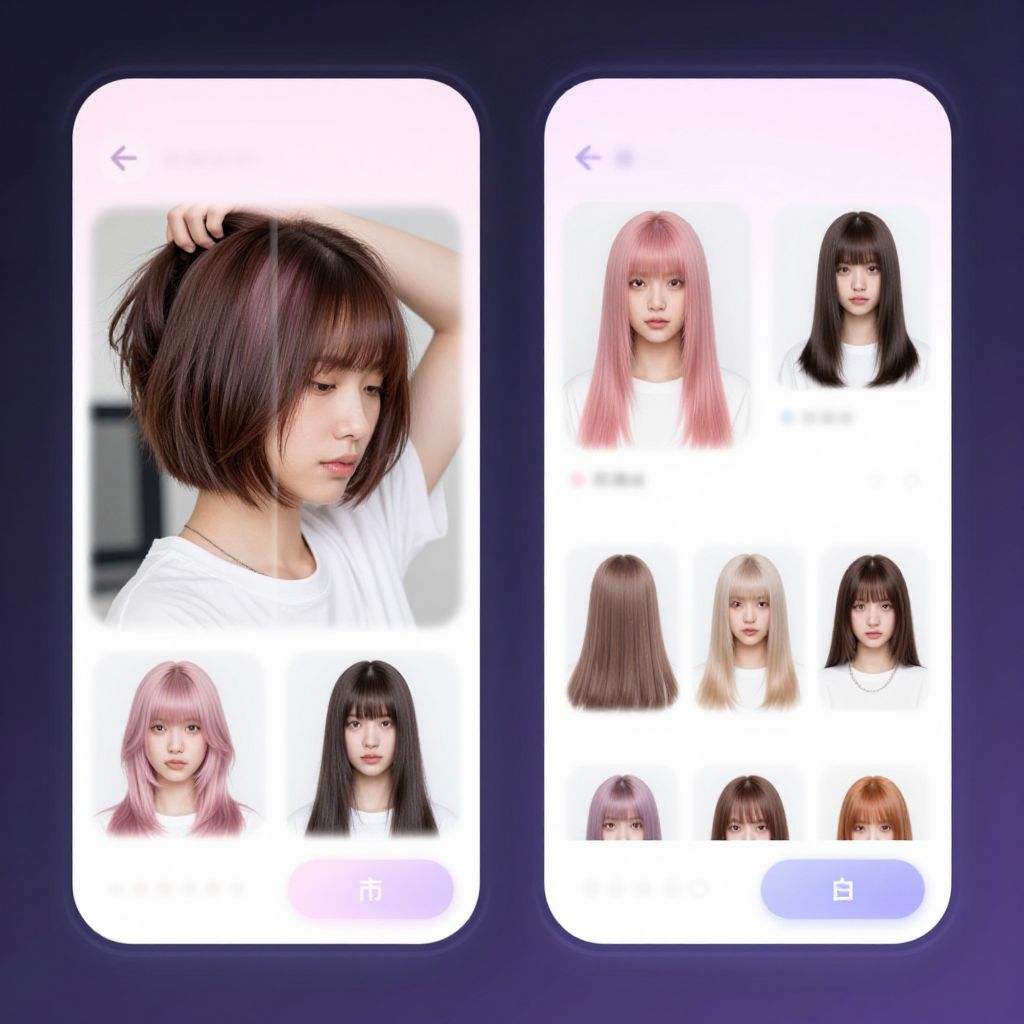 Hair style try on app graphic showing a side-by-side comparison of user’s photo and virtual hair model, various lengths and colors previewed, pastel color palette, smooth interface with intuitive controls, futuristic tech vibe emphasizing digital hairstyle innovations.