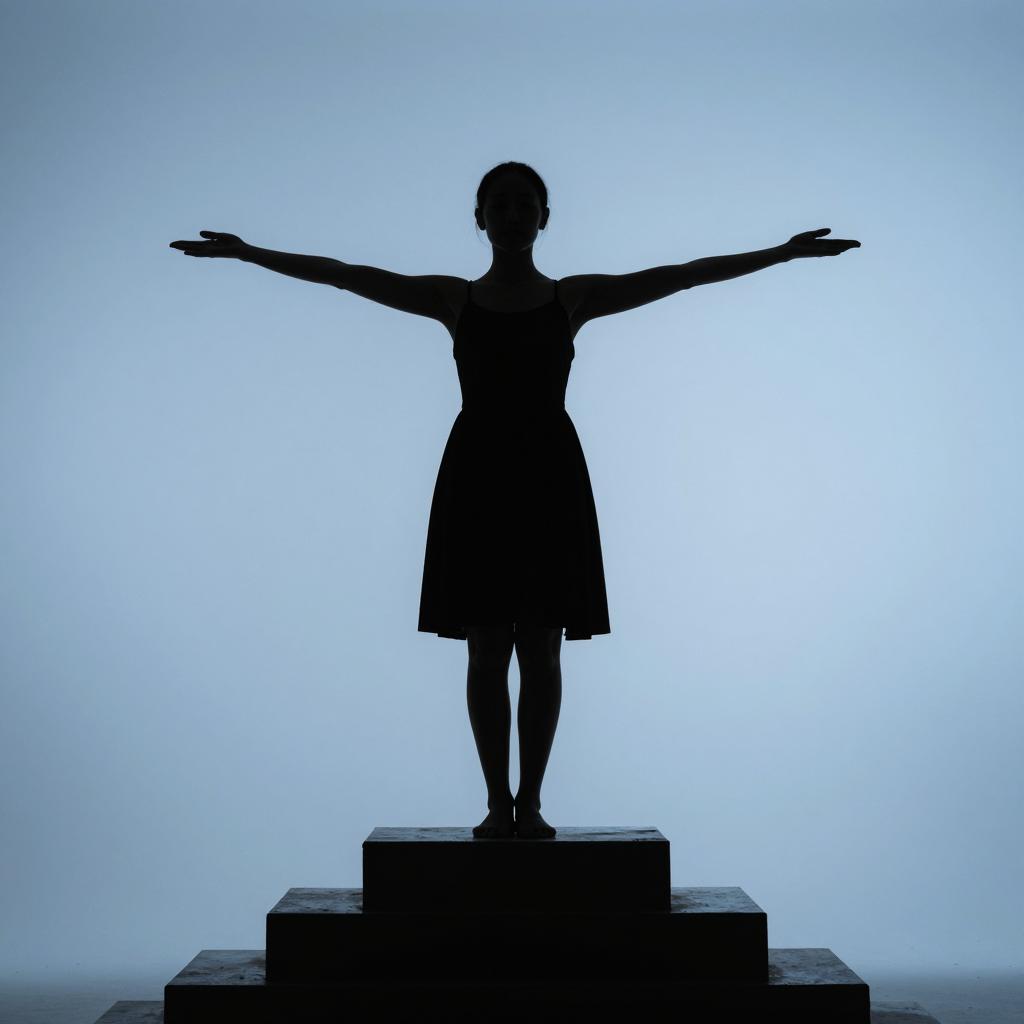 Silhouette of a person standing on a tiered pedestal with arms outstretched, against a bright blue gradient background. The person is wearing a dress and has a round head. The blue light highlights the silhouette, creating a dramatic contrast. The person's facial expression is not visible. The image uses a high-contrast, minimalist visual style.