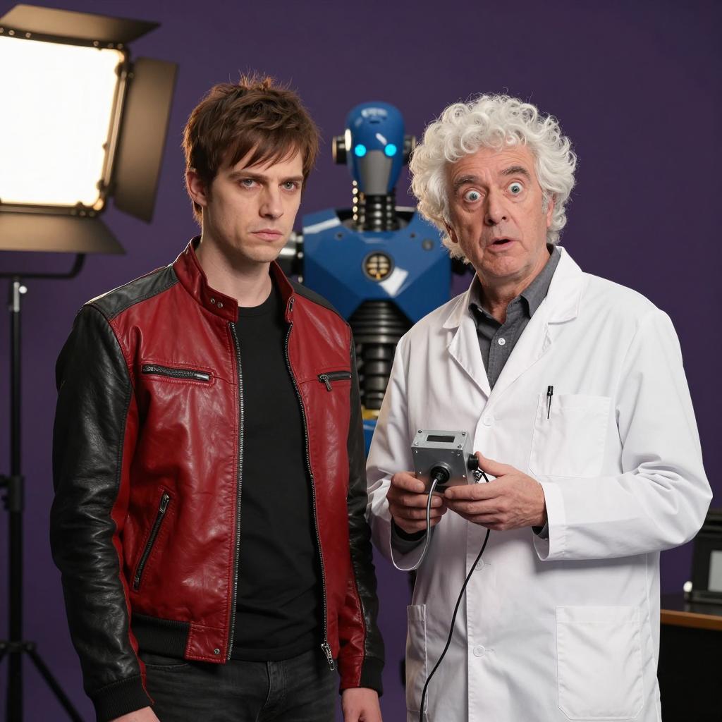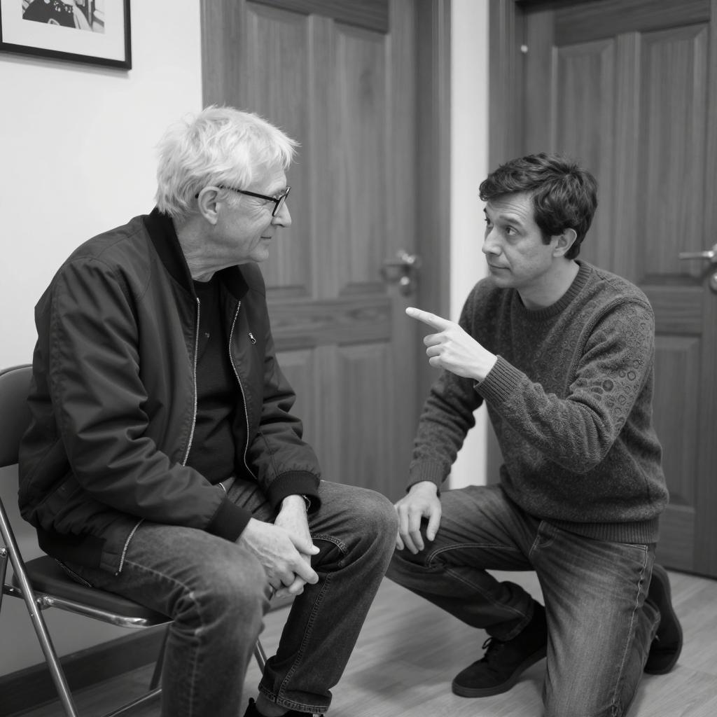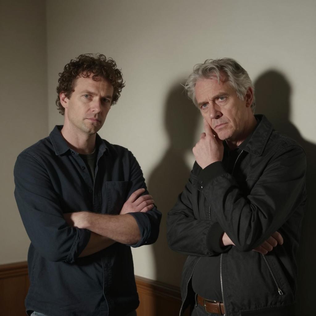 Two men, one older with gray hair, one younger with brown hair, both wearing dark blue shirts, sitting beside a wooden table with electronic equipment and cables, white background. Older man stands, younger man sits. Cables trail on floor.