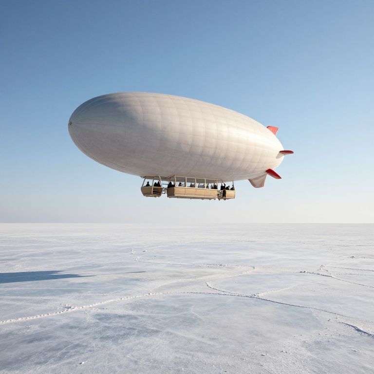 A serene expanse of salt ice drifts beneath a sky where vintage zeppelins glide effortlessly, their passengers suspended in a dreamlike journey through a landscape that defies the boundaries of earth and air.