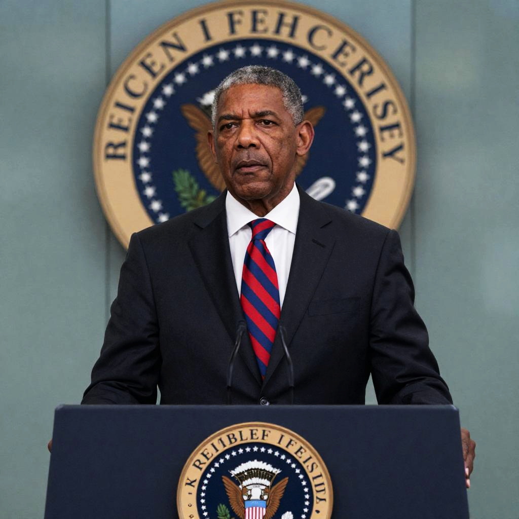 Serious African-American man wearing a dark suit, white shirt, and red-and-blue striped tie, standing behind a podium with a presidential seal. The background features a large, circular seal resembling that of the President of the United States and a glass wall.