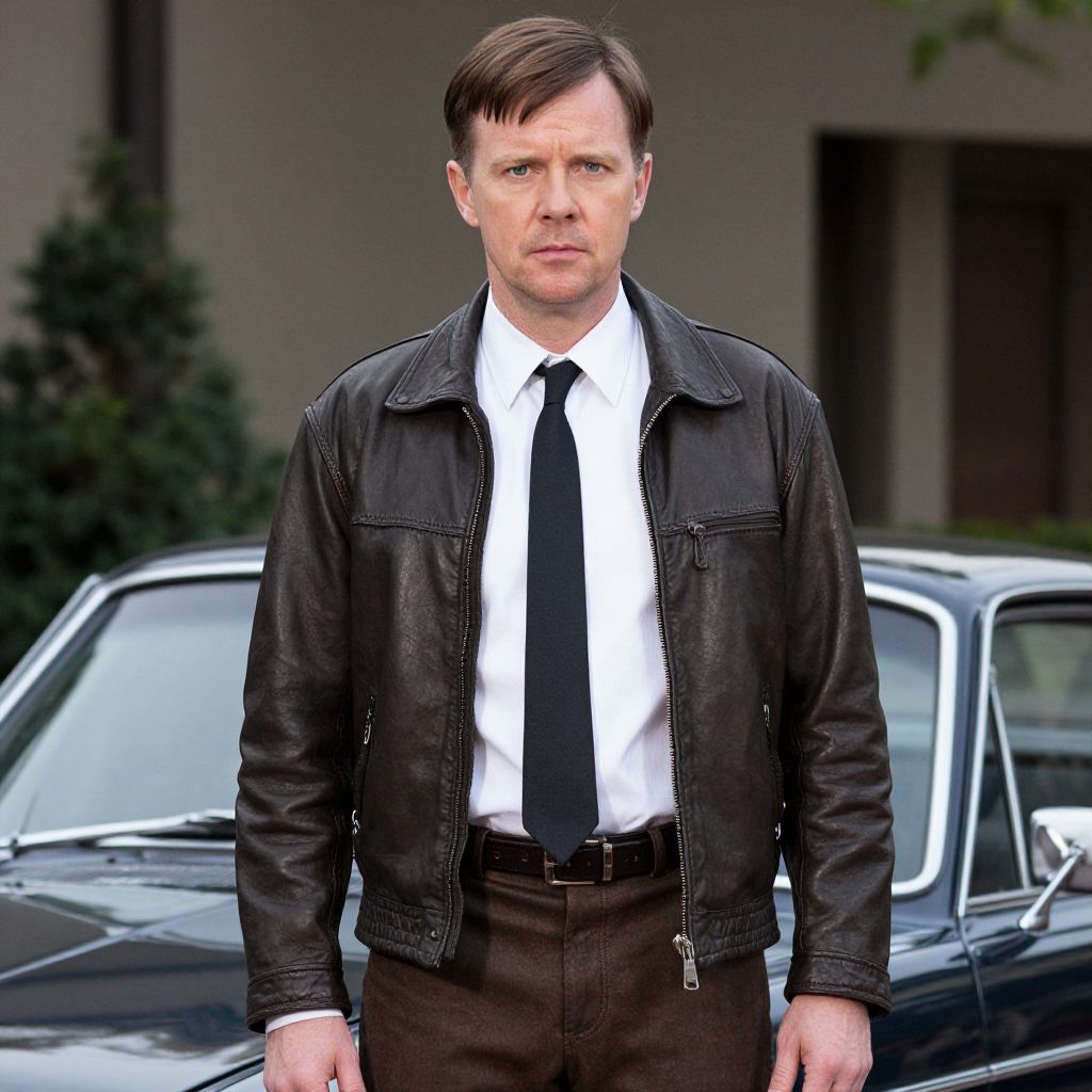 "Marty Mcfly Fancy Dress, man in a leather jacket and tie standing in front of a car"