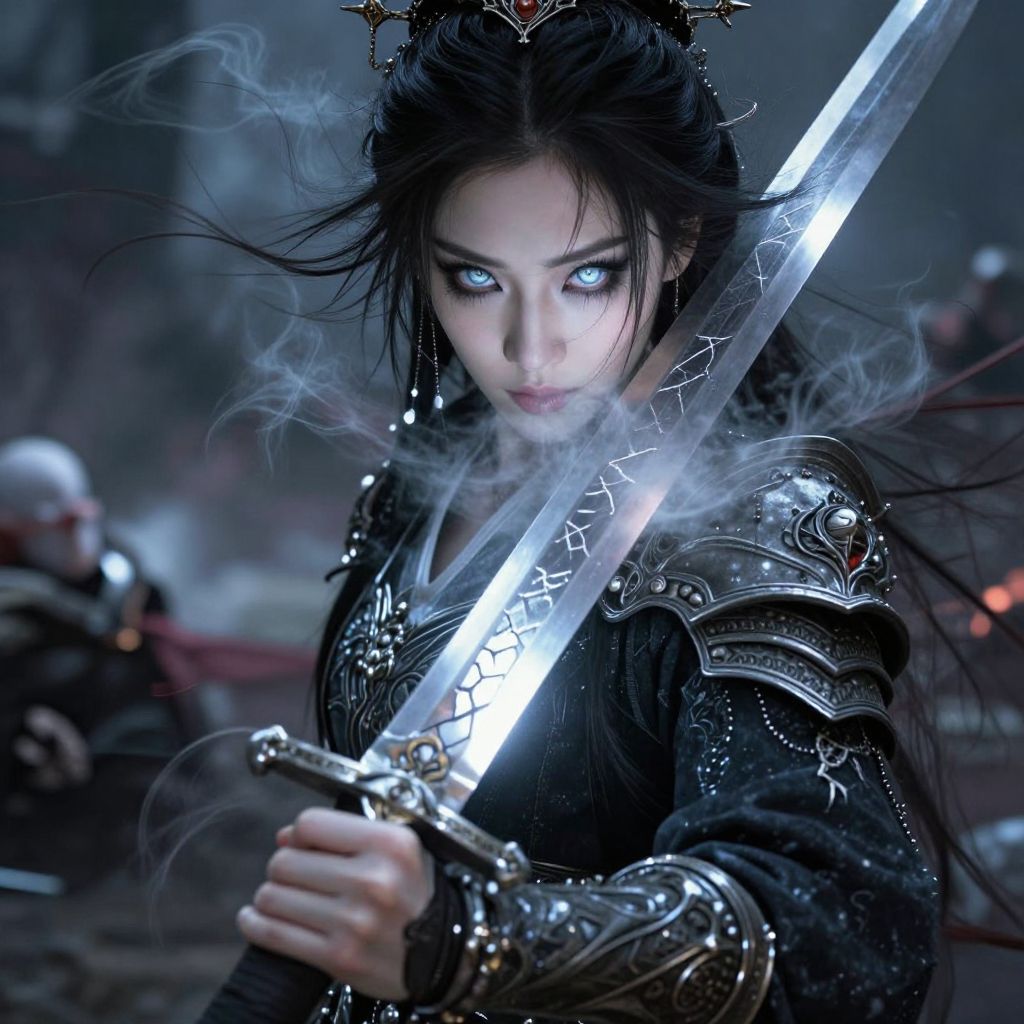 Digital artwork of a fierce, dark-haired woman with glowing blue eyes, holding a glowing, silver sword with intricate, crackling patterns. She wears ornate, black armor adorned with silver details and a jeweled crown. Her black hair is wild and windswept. In the blurred background, a bald, armored figure stands amidst a smoky, dimly lit battlefield with red and blue lights. The woman's intense gaze and the ethereal glow of her sword create a dramatic, mystical atmosphere. The image is highly detailed, with a dark, fantasy-themed color palette.