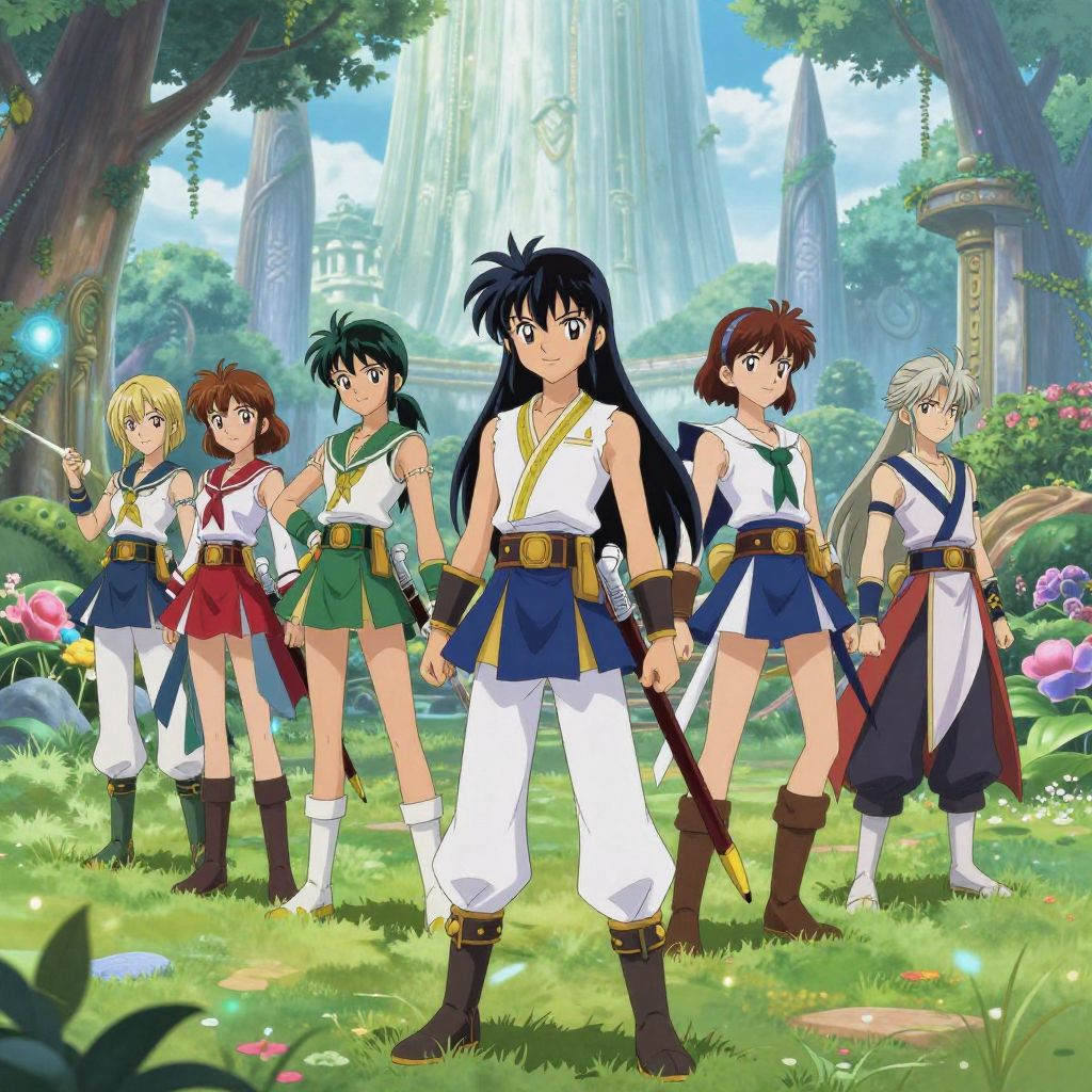Best AI art generator anime scene, lush fantasy landscape with anime-style characters in detailed costumes, magical effects, soft color palette, intricate backgrounds, high resolution, blending classic anime aesthetics with modern AI-generated creativity.
