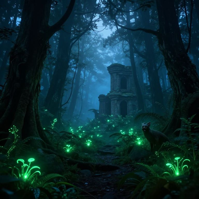 Mysterious blue-lit forest with glowing green mushrooms, ancient ruins, and a shadowy creature in the background. Digital fantasy artwork.