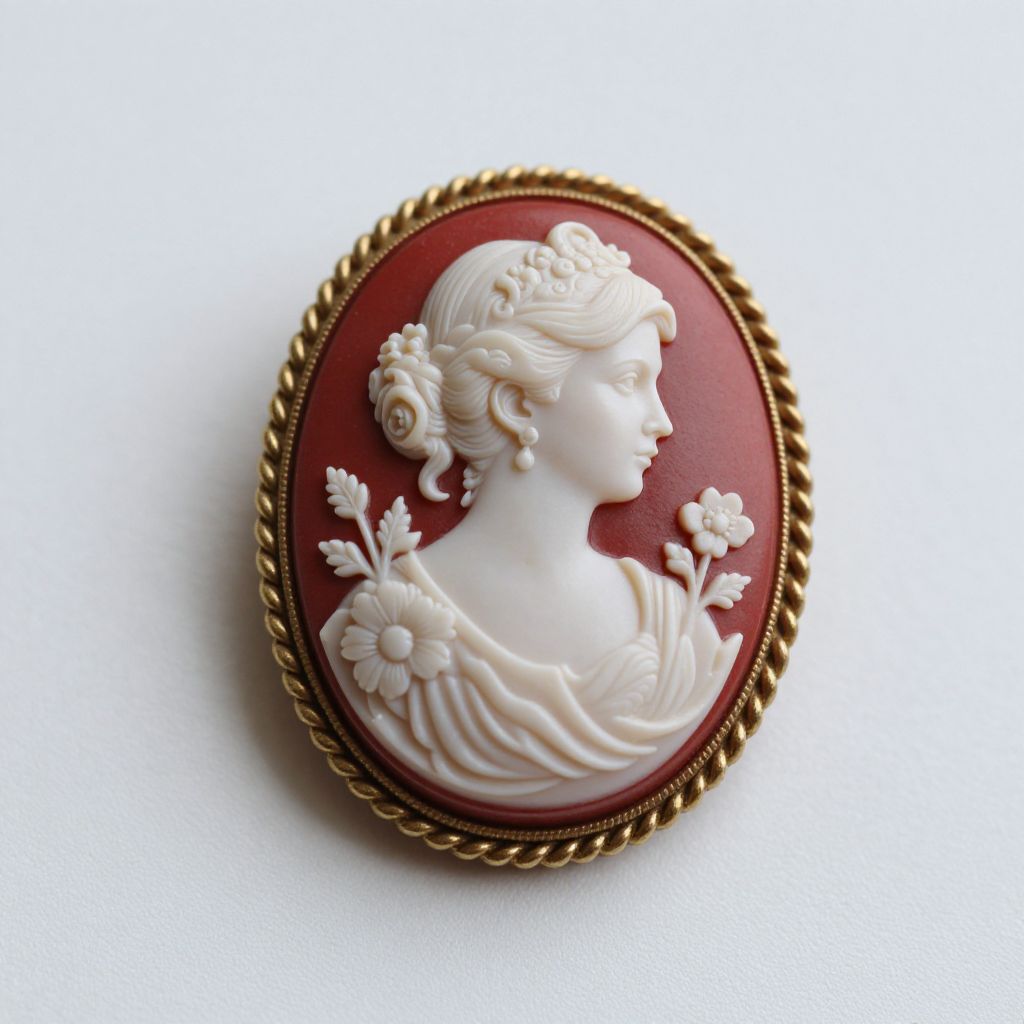 Elegant cameo brooch featuring a profile portrait of a woman adorned with floral details, set against a deep red background within a gold rope border, perfect for farmhouse chic and rustic accessories.