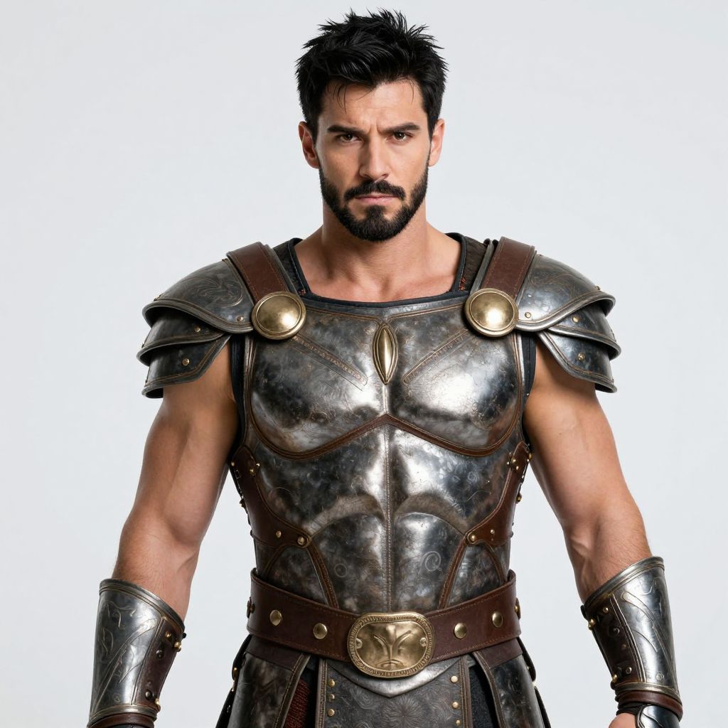 Photograph of a muscular, bearded man with short, dark hair, wearing ancient Roman-style armor. The armor is metallic, with a reflective, slightly worn texture, featuring bronze shoulder guards, a chest plate, and a brown leather belt with a large, circular bronze buckle. His arms are also armored, extending to his forearms. The man has a serious, focused expression, with slightly furrowed brows and a neatly trimmed beard. The background is pure white, making the subject stand out prominently. The lighting is even, highlighting the metallic sheen of the armor and the man's defined muscles.