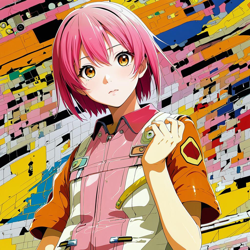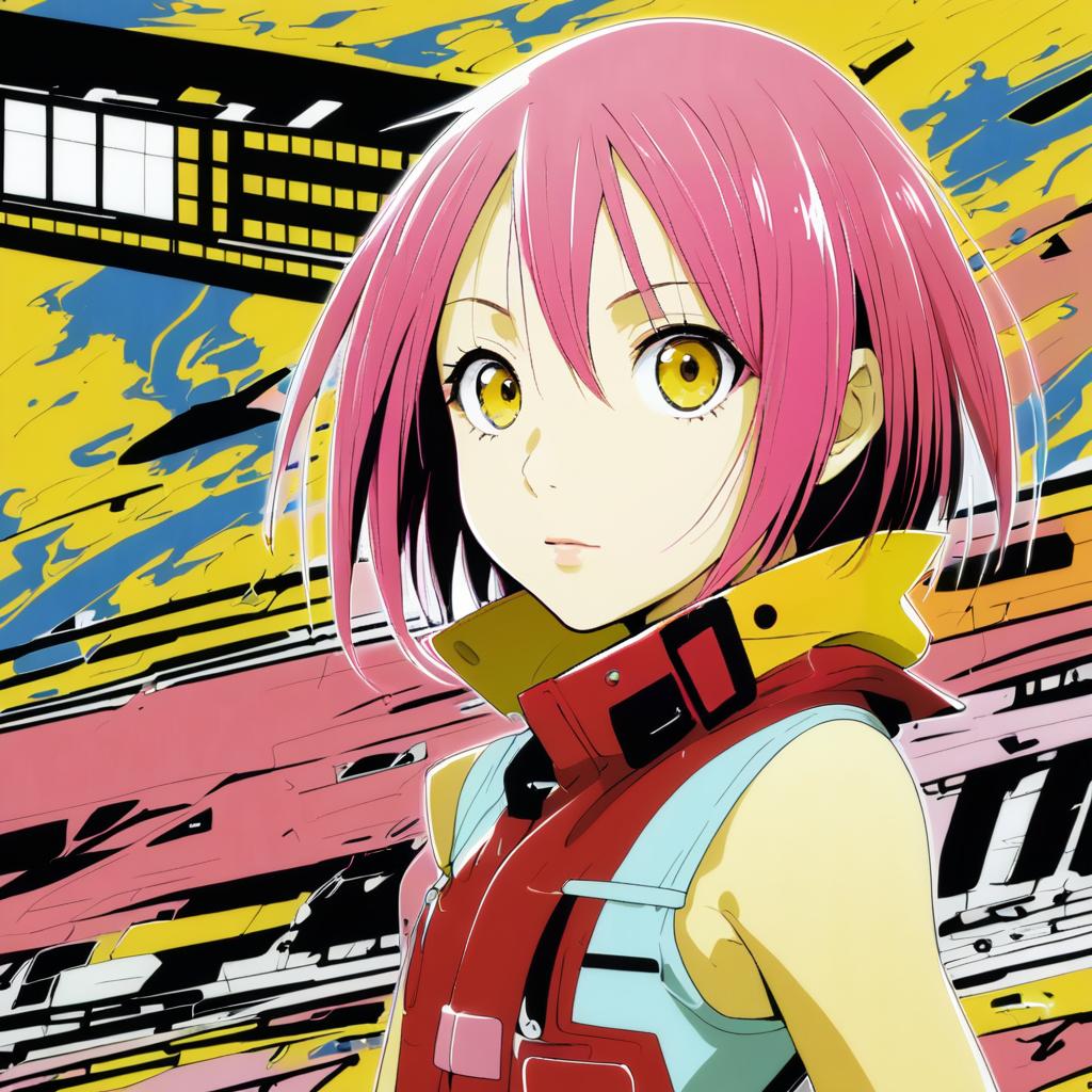 Haruhara haruko, flcl, 1girl, yellow eyes, pink hair, short hair, by artist takamine nadare, anime