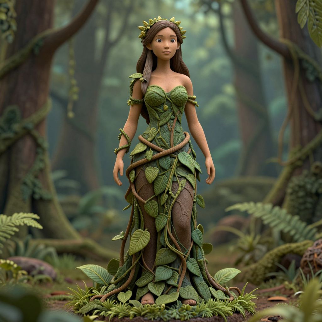 Digital artwork of a young, brown-skinned woman in a leafy, vine-adorned forest dress with a crown, standing in a lush,