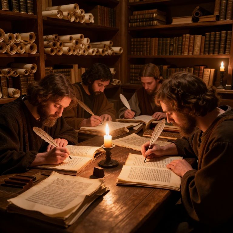 Photograph of four men with dark, curly hair and beards, dressed in medieval-style dark robes, seated at a wooden table in a dimly lit library. They are intently copying manuscripts by candlelight, with one candle casting a warm, flickering glow. Open books and quills are scattered across the table. Shelves filled with rolled parchments and bound books line the background, creating a historical, scholarly atmosphere. The men's focused expressions and the warm candlelight emphasize a sense of concentration and dedication to their task.
