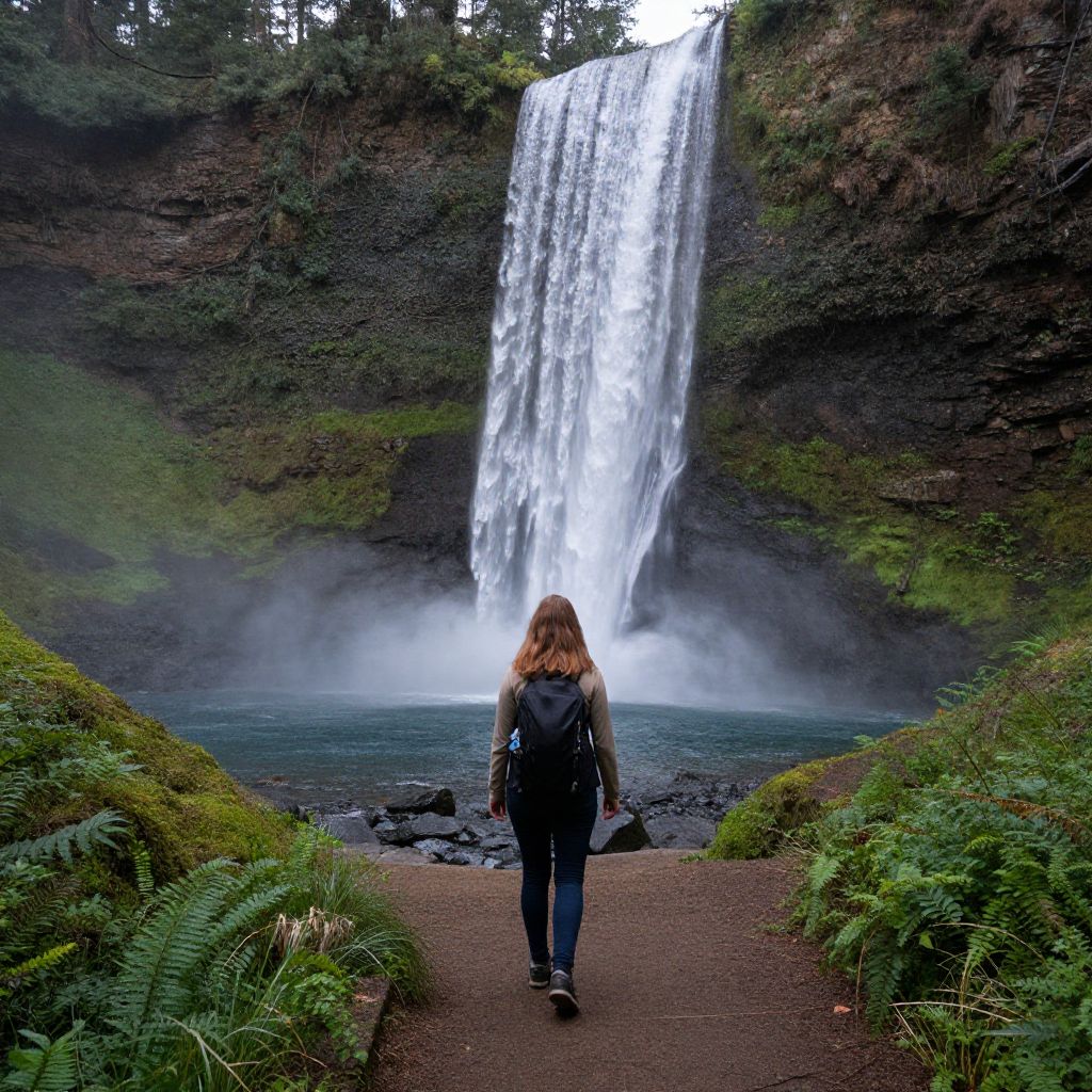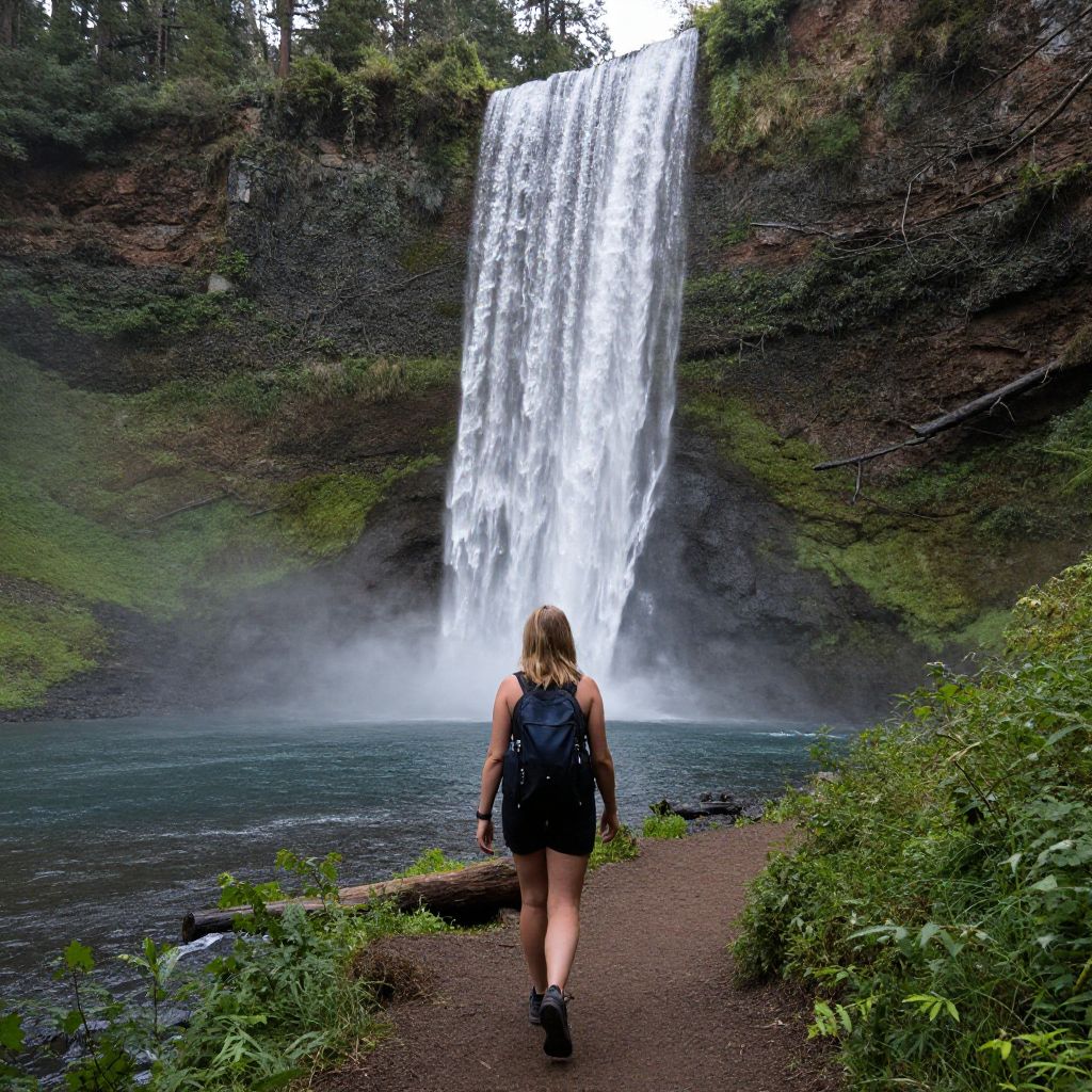 Photograph of a woman with red hair, wearing a backpack, standing on a path, facing a tall, misty waterfall in a lush, green