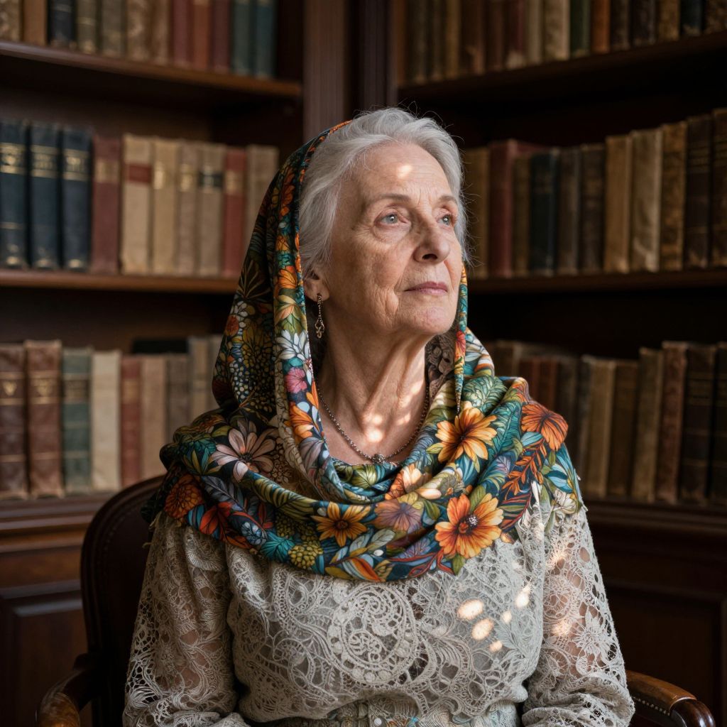 Photograph of an elderly white woman with white hair, wearing a colorful floral headscarf and a white lace dress. She sits in a wooden library with tall bookshelves filled with various books in the background. The sunlight filters through the window, casting soft light and shadows on her face. Her expression is calm and contemplative, gazing slightly to the right. The floral headscarf features vibrant orange, yellow, and green flowers, adding a vivid contrast to her lace dress and the dark wooden surroundings.
