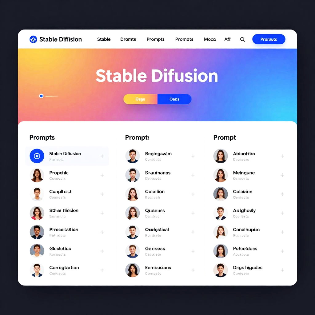 Concept art of a stable diffusion prompts website dashboard with prompt collections, categorized neatly, featuring gradient backgrounds, sans-serif fonts, vibrant highlight colors, dynamic loading animations and AI-themed icons, suggesting creativity and AI collaboration.