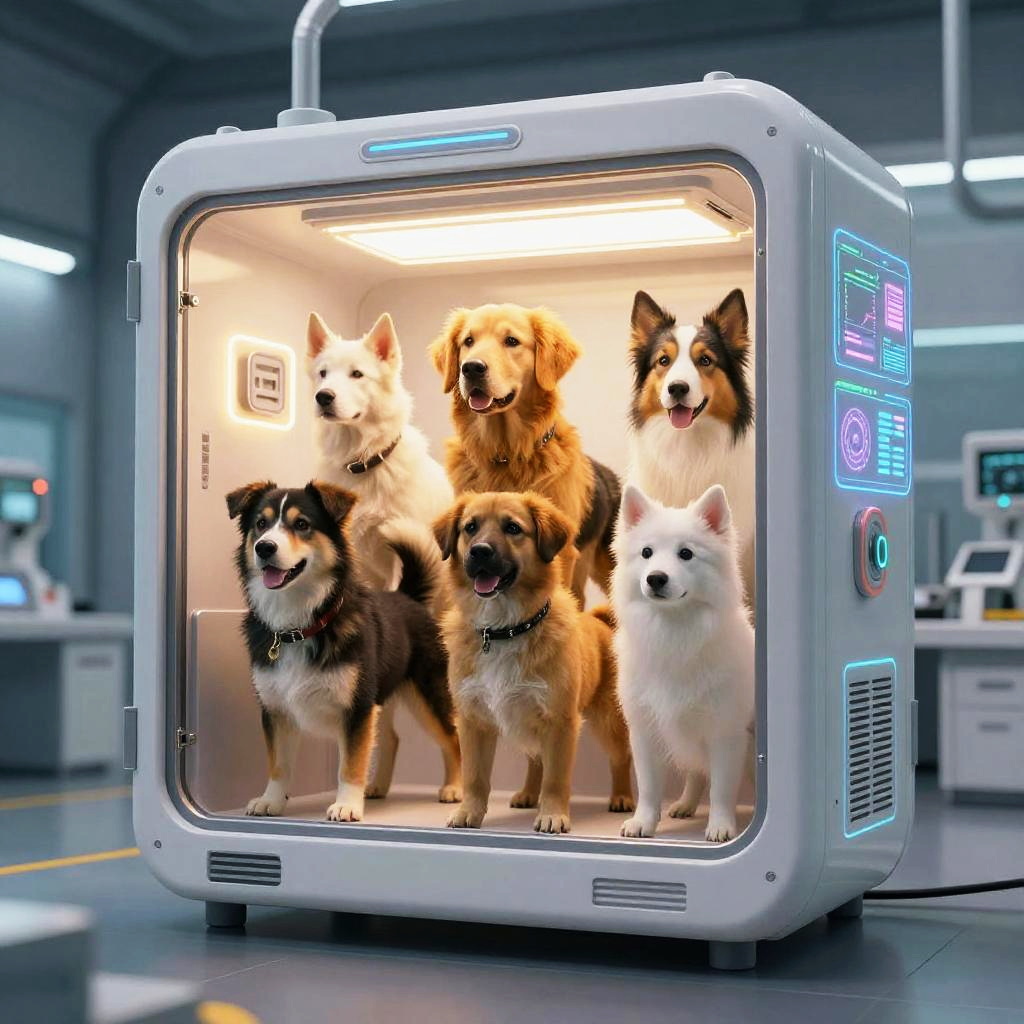 Dog generator concept featuring a futuristic machine creating diverse breeds of dogs instantly, surrounded by glowing lights and holographic interfaces, in a sleek sci-fi laboratory setting, vibrant colors, hyper-realistic style.