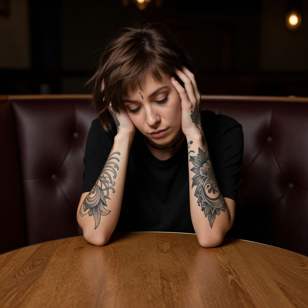 Photograph of a tattooed woman with short, layered brown hair, sitting at a round wooden table in a dimly lit, tufted leather booth. She's wearing a black shirt and has elaborate tattoos on her arms and forehead, with her hands resting on her head, looking down with a pensive expression. The background is dark and blurred, adding to the moody, introspective atmosphere.