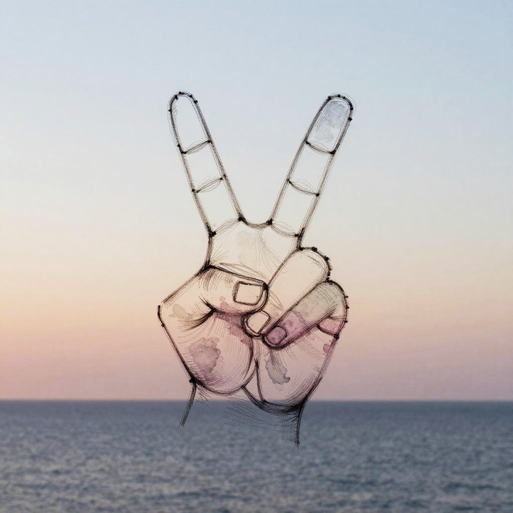 Upside down peace sign formed by delicate hand-drawn lines and watercolor splashes, floating gently over a calm ocean horizon during sunset, soft pastel colors blending harmoniously, evoking tranquility and introspection.