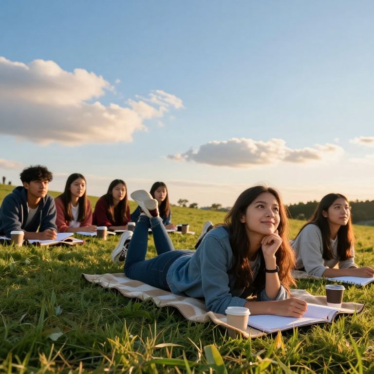 A group of college students relaxing on a grassy hillside during a weekend afternoon, lying on blankets with cups of coffee and notebooks open, one person looking up at the sky with a thoughtful smile, the background shows a clear blue sky with soft clouds and a sunset casting warm tones across the landscape.