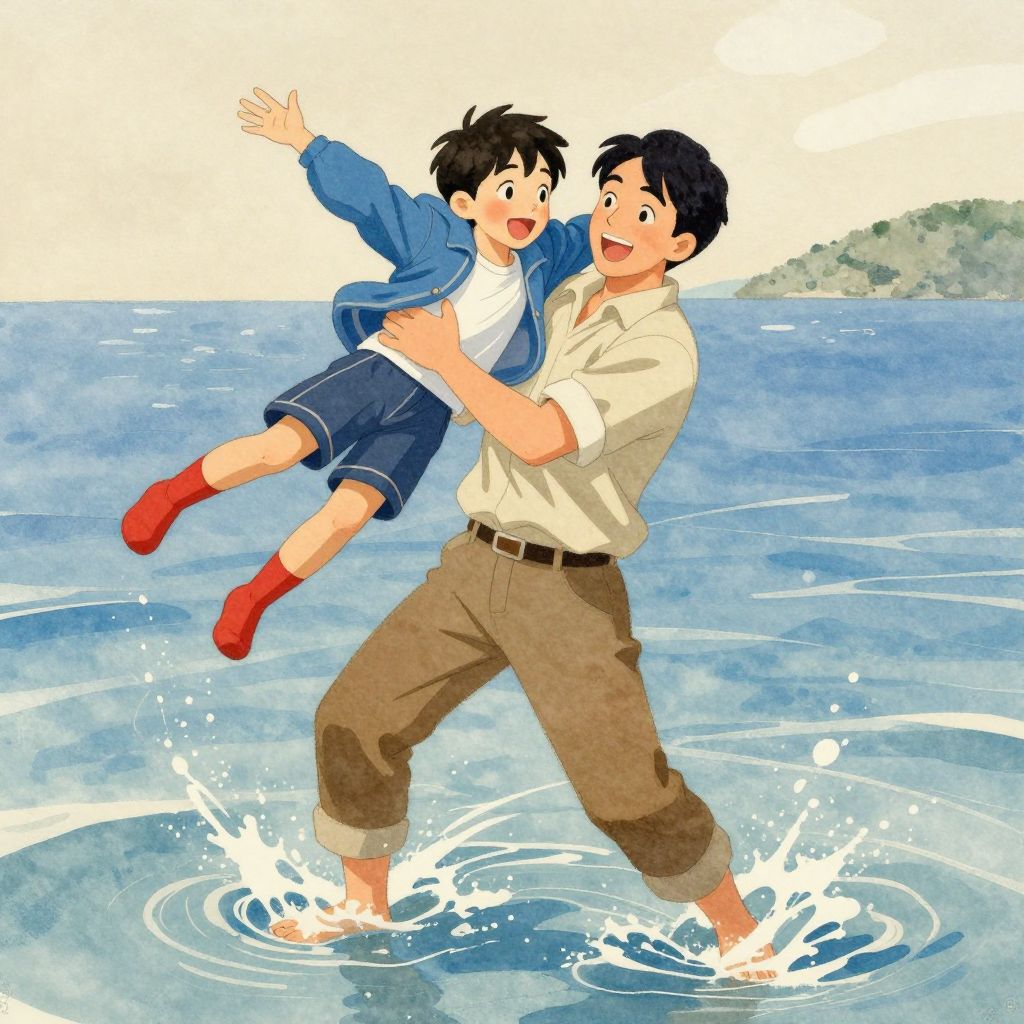 This digital anime-style illustration depicts a joyous father carrying his young son in a playful splash near a serene ocean. The father, with black hair and wearing a beige shirt, brown pants, and no shoes, smiles widely as he lifts his son. The son, also with black hair, is dressed in a blue jacket, white shirt, blue shorts, and red socks, with his arms outstretched in delight. The background features a calm blue sea and a distant green hill. Splashes of water surround their feet, emphasizing their playful interaction. The father's expression and the son's exuberance convey a strong sense of happiness and bonding.