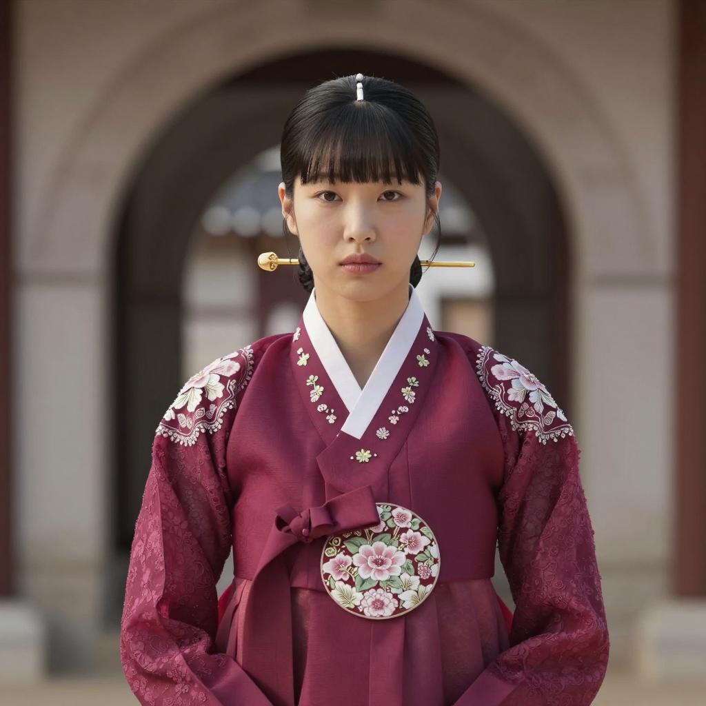 Akaza costume, photograph of a young Asian woman, traditional Korean hanbok, teal and red robes with intricate patterns, long black braids, standing in a sunlit, red-painted traditional Korean building corridor, soft focus background, realistic lighting, gentle expression, hands at sides, detailed fabric ure, cultural attire, daytime, traditional architecture, calm and serene mood