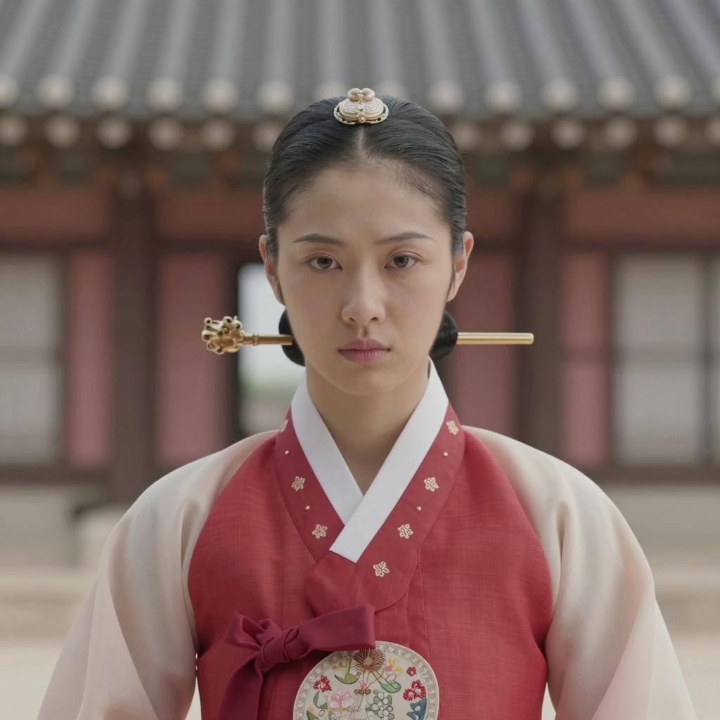 Portrait of a young Asian woman wearing a traditional Korean hanbok with teal and red colors and intricate patterns. She has long black braided hair adorned with hair accessories and is standing in a sunlit corridor of a traditional Korean building with red-painted pillars and wooden architecture, captured with soft focus and realistic lighting.