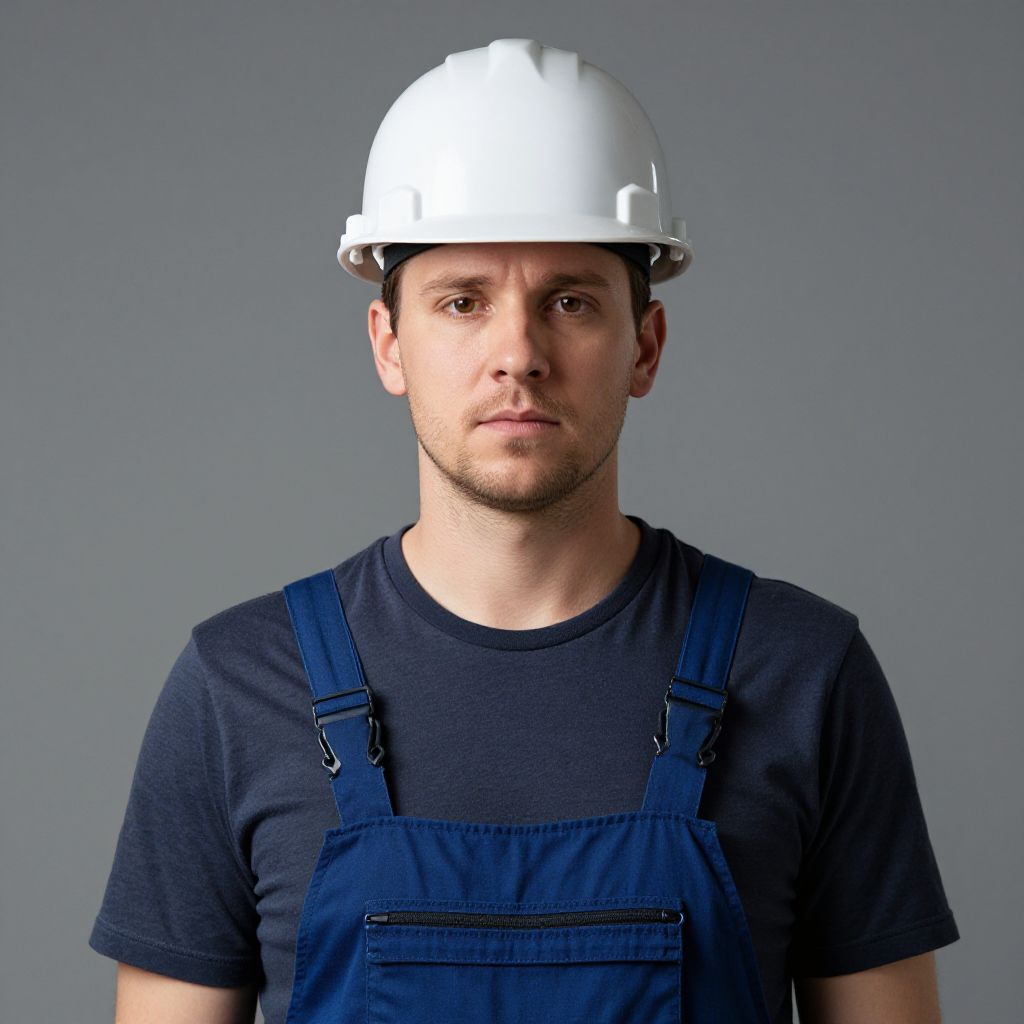 Photograph of a young Caucasian man with light skin, short brown hair, wearing a white hard hat, dark blue shirt, and blue overalls,
