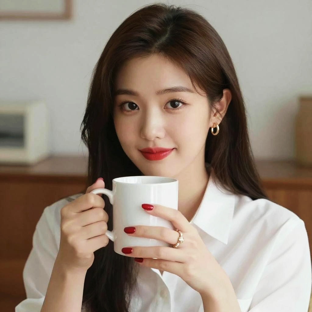 Cup, jewelry, 1girl, ring, holding cup, mug, blurry background, solo, realistic, blurry, holding, red lips, earrings, looking at viewer, brown hair, smile, red nails, photorealistic, shirt, white shirt, asian, makeup, k-pop, portrait, lipstick