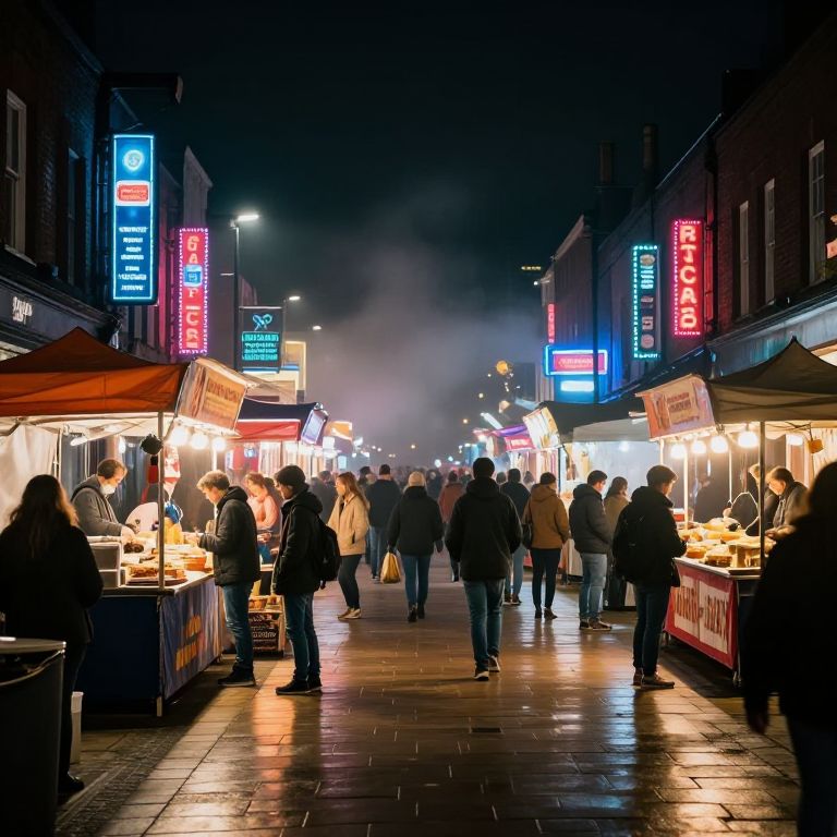 Night scene in Stockport's market area, colorful neon signs illuminating street vendors and lively crowd, atmospheric fog and glistening pavement, diverse street food stalls, energetic city nightlife vibe, cinematic composition with high contrast lighting.