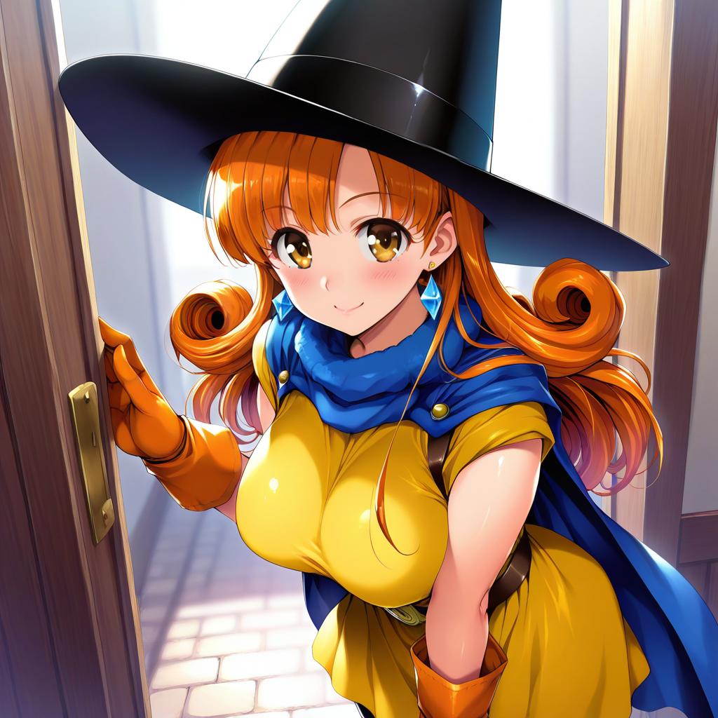 Anime-style illustration of a young female witch character with orange curly hair, wearing a large black witch hat, blue cape, yellow dress, and orange gloves. She has brown eyes and blue diamond-shaped earrings, smiling gently while standing in a doorway with light streaming in.