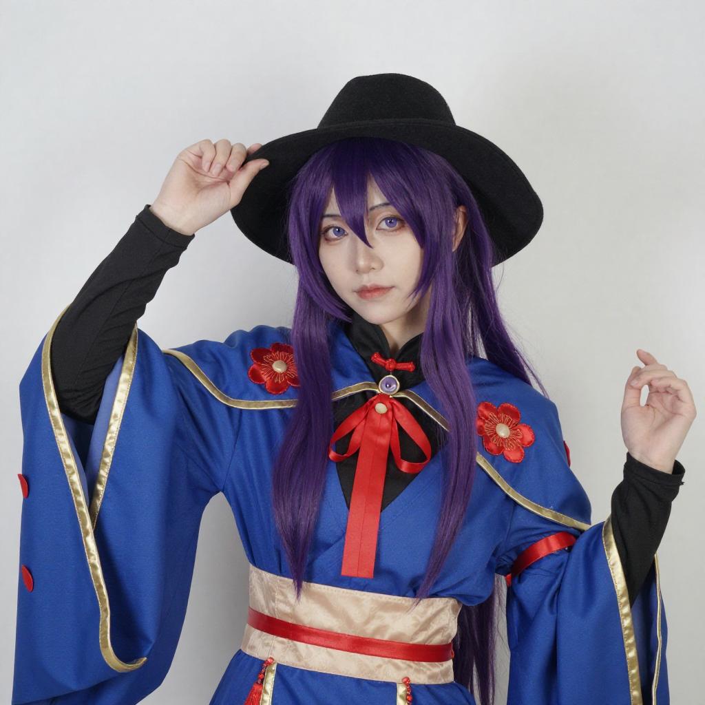 Photograph of a person with long, purple hair, wearing a black hat, blue and gold cape with red floral accents, and red ribbons. They have pale skin, red eyes, and a shy expression, leaning forward slightly. The background is a bright, white-lit room with purple lighting.