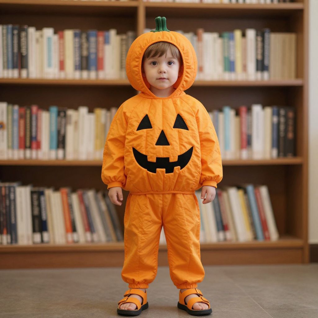 Photograph of a young child standing in front of a wooden bookshelf filled with various books. The child, with light skin and brown hair, is wearing an orange pumpkin onesie with a hood featuring a green stem, and a black jack-o'-lantern face. The onesie is slightly puffed, and the child is also wearing black sandals with orange straps. The floor is a smooth, light brown surface. The bookshelf has multiple shelves, with books of different colors and sizes. The child is centered in the image, looking directly at the camera with a neutral expression.