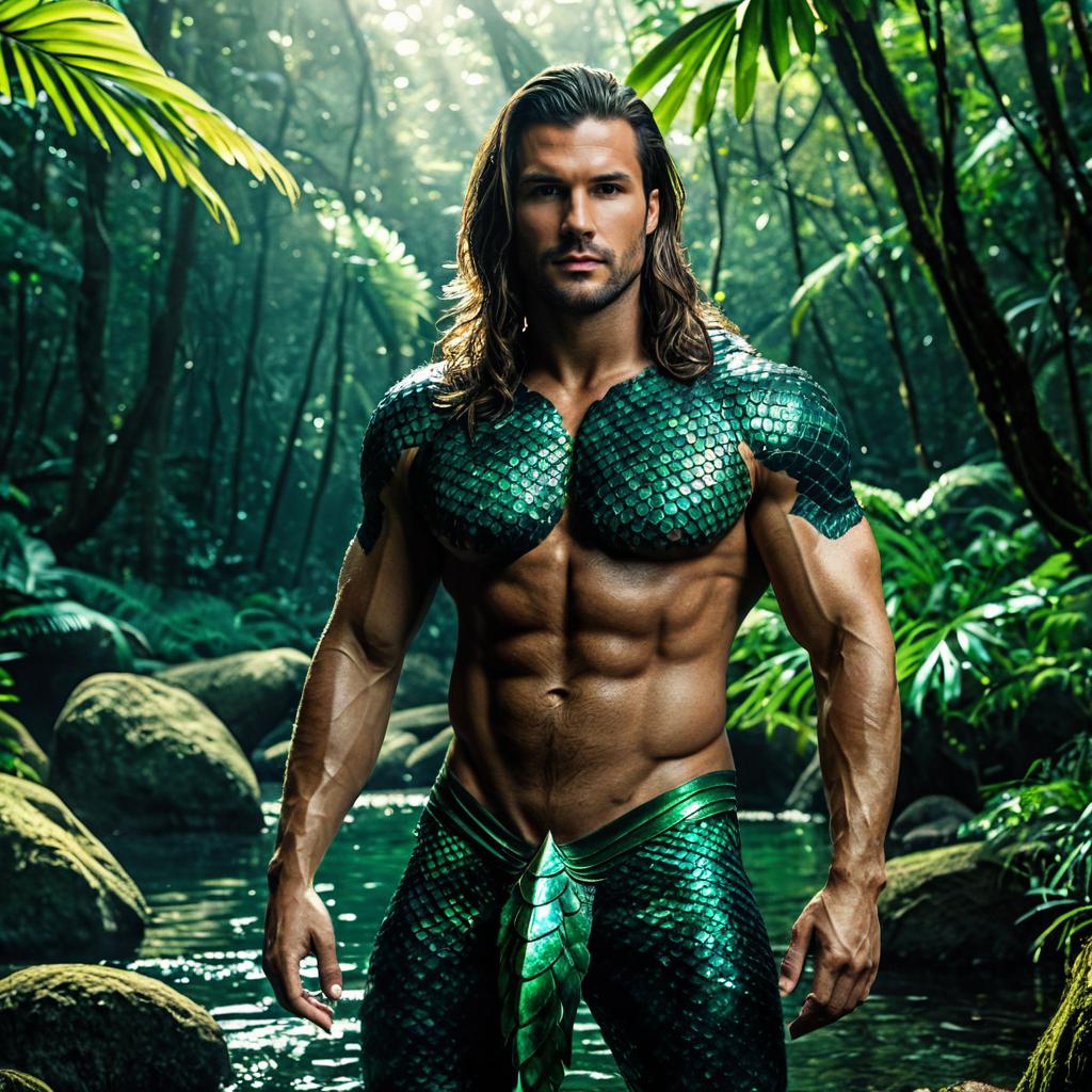 Muscular Man Holding Snake in Jungle