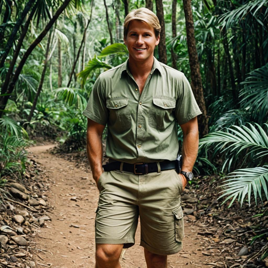 Steve irwin costume, photograph of a muscular man with blonde hair, wearing a green cap, olive shirt, and khaki pants, standing in a lush jungle, holding a snake, two snakes on either side, realistic CGI style, daytime, detailed foliage background, man has confident expression, casual jungle explorer outfit, name badge on shirt, natural light, realistic ures, snakes have detailed scales, tropical rainforest ambiance