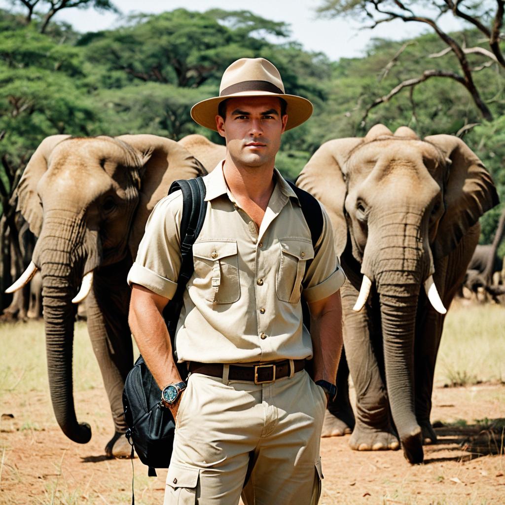 Photograph of a muscular blonde man confidently standing in a lush tropical rainforest. He is wearing a green cap, olive green short-sleeve button-up shirt with name badge, and khaki pants. The man holds a patterned snake in one hand, surrounded by dense green foliage. The natural light highlights the detailed scales of the snake and the vibrant jungle setting.
