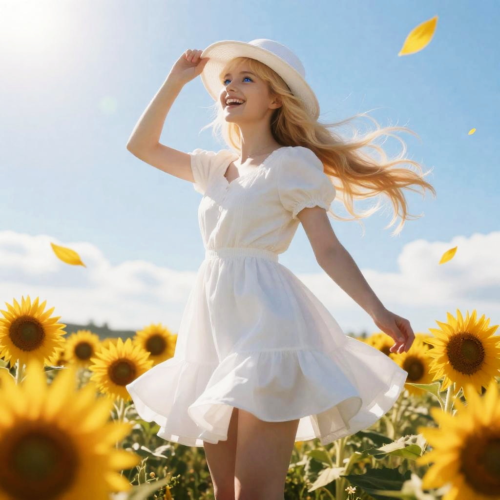 (8k, RAW photo, realistic, photo-realistic:1.5), masterpiece, best quality, high resolution, extremely detailed, detailed background, cinematic lighting, dynamic angle, lens flare, dramatic, 1girl, cute girl, solo, wind, pale-blonde hair, blue eyes, very long twintails, white hat, white dress, blue sky, laugh, flying petal, flowery field, sky, sunflower, sun, field