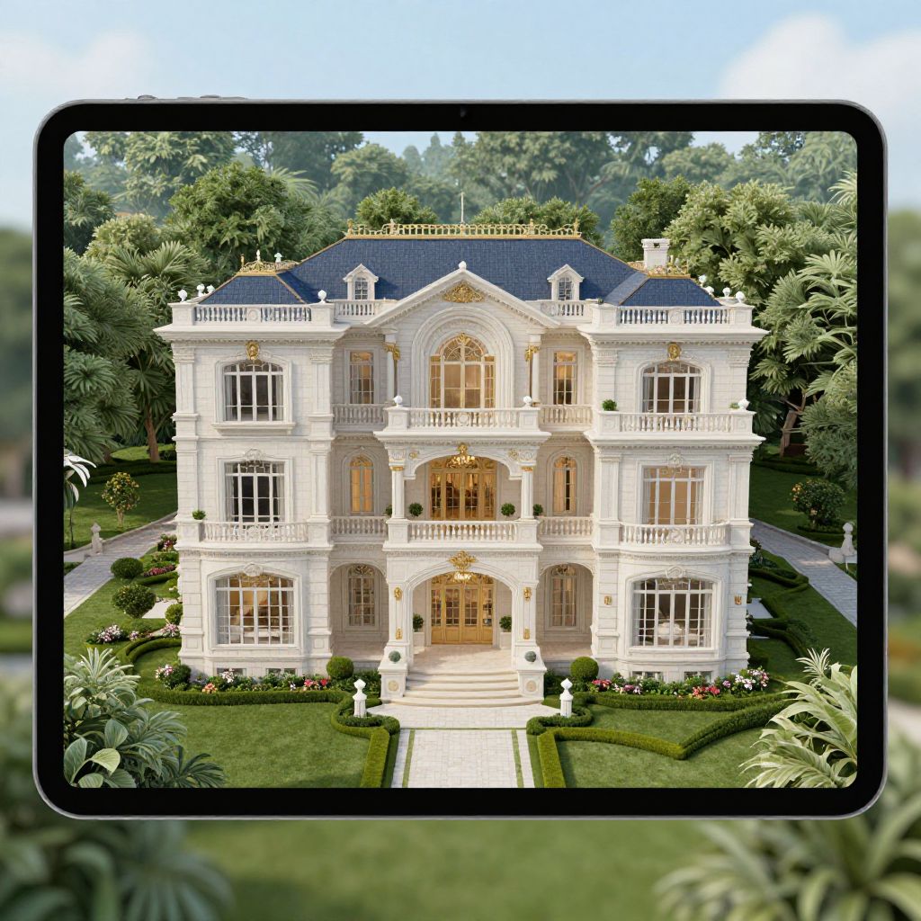 Mansion floor plans generator on a digital tablet, displaying multi-level layouts, ornate rooms, large windows, balconies, surrounded by lush green landscape, seamless integration of tech and classical elegance, high resolution visualization