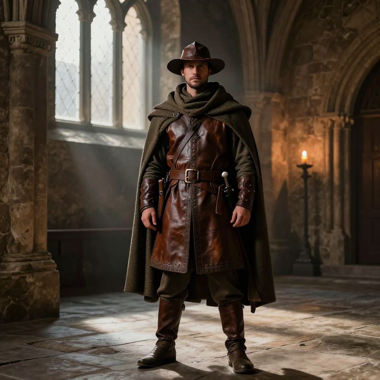 A male adventurer wearing a detailed medieval outfit featuring a leather jerkin, a woolen hooded cloak, a leather hat with a brim, a thick scarf wrapped around his neck, and sturdy leather boots. He stands confidently on a stone floor inside a dimly lit medieval hall, with weathered stone walls and a grand stone building in the background, showing arches and turrets. The scene is lit by soft candlelight and early morning sunlight filtering through high windows, casting warm shadows. The atmosphere is mysterious and timeless, evoking a sense of ancient history and quiet strength.