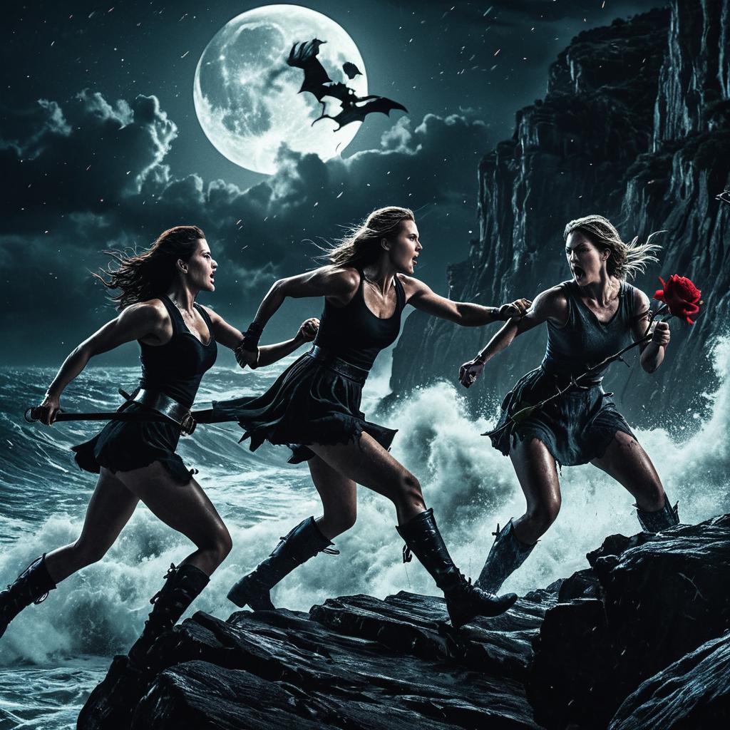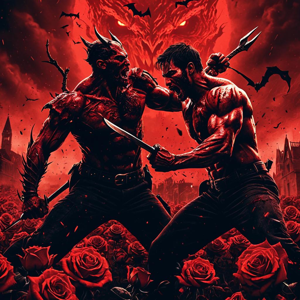 Roses Transformed and vicious yet somewhat attractive male gargoyles fighting on the rooftop of a gothic cathedral at midnight with cinematic lighting and composition, in the style of an epic action-horror-adventure movie poster. Ultra realistic visuals and high detail.