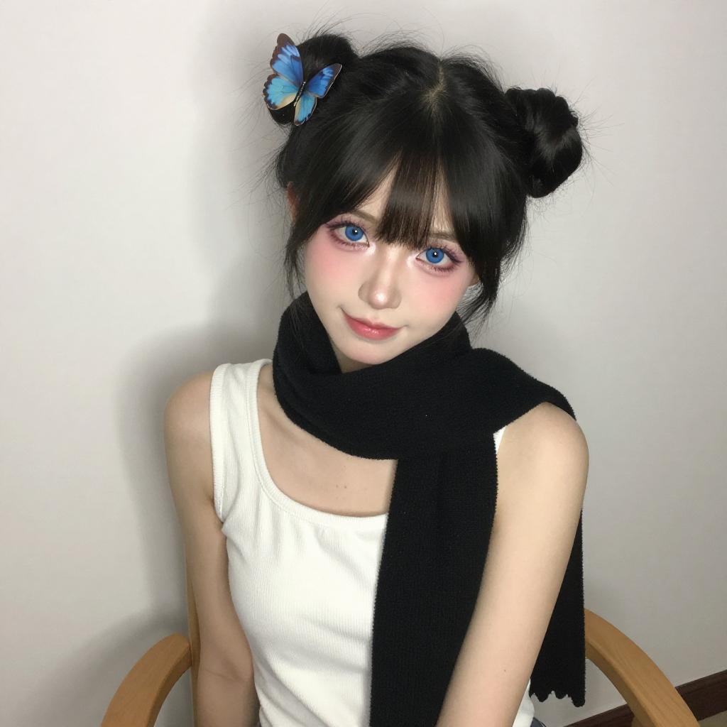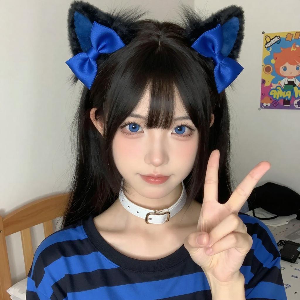 Photograph of an Asian woman with pale skin, black hair, and large blue eyes, wearing a blue and black striped top, black cat ears with blue bows, and a white choker. She makes a peace sign with her right hand, smiling slightly. The background shows a brightly lit room with a wooden chair and a colorful poster on the wall.