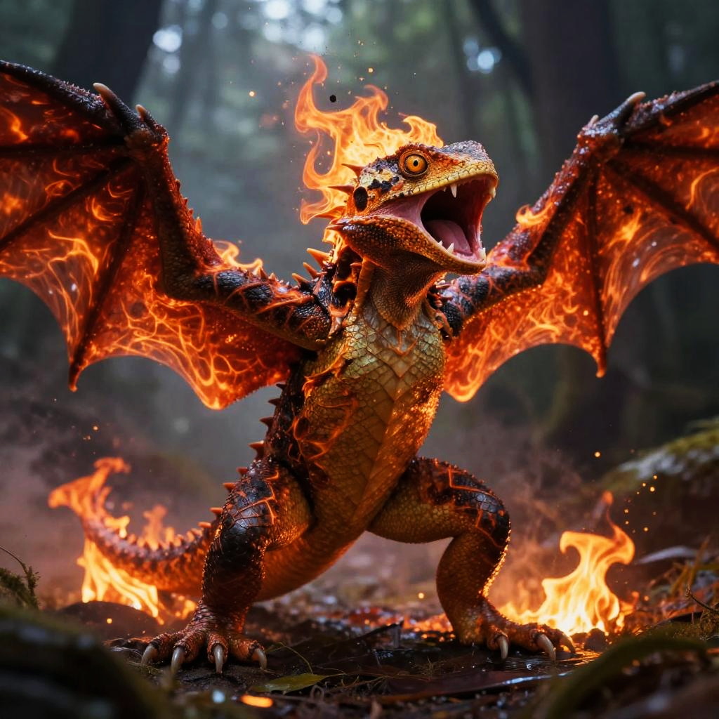 Ember-lizard creature with reptile skin and streaks of flame, roaring fiercely while spreading fiery wings, burning forest at dusk, action shot, skin pores, very dark lighting, heavy shadows, detailed face, vibrant, photorealistic, dramatic, sharp focus, 8k, (intricate:1.4), decadent, (highly detailed:1.4), digital painting, concept art, octane render, artstation, smooth illustration, global illumination, studio light, volumetric light, atmospheric fog, particles floating, embers, wet surfaces, rim light, depth of field
