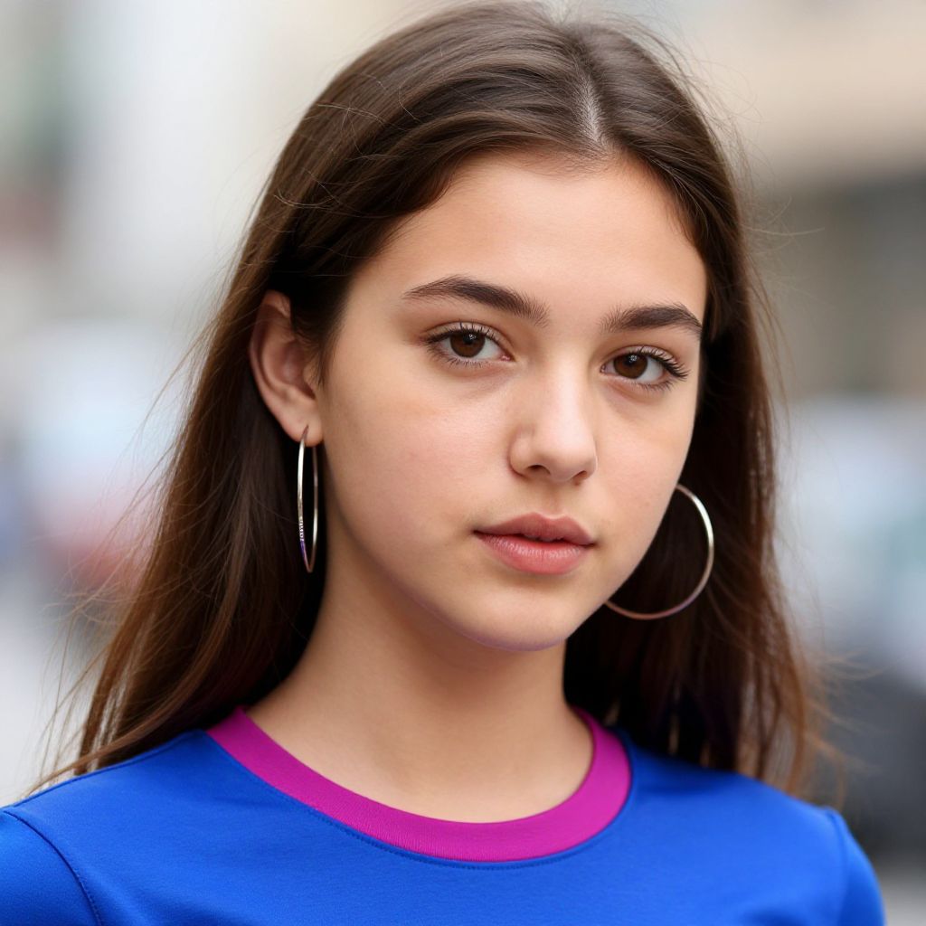 Photograph of a young woman with long, straight brown hair and light skin, wearing a blue shirt with a pink collar. She has brown eyes, subtle makeup, and wears large silver hoop earrings. Her expression is neutral, and she looks directly at the camera. The background is blurred, with indistinct colors suggesting an outdoor urban setting. The image has a soft focus on her face, highlighting her features while the background remains out of focus. The overall style is realistic and natural.