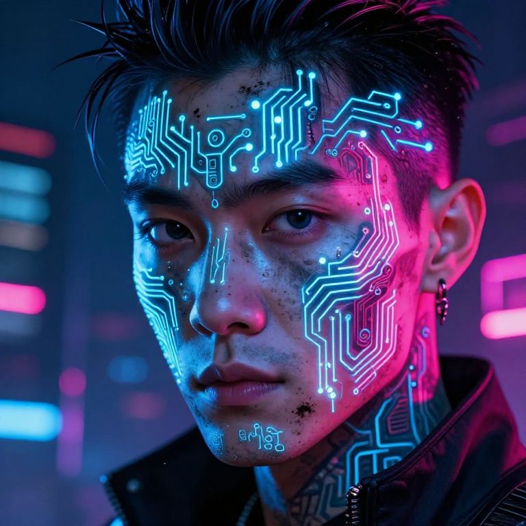 Cyberpunk portrait of Asian man with glowing neon circuit patterns on face, illuminated by blue and pink lights. Dark hair, serious expression, futuristic look